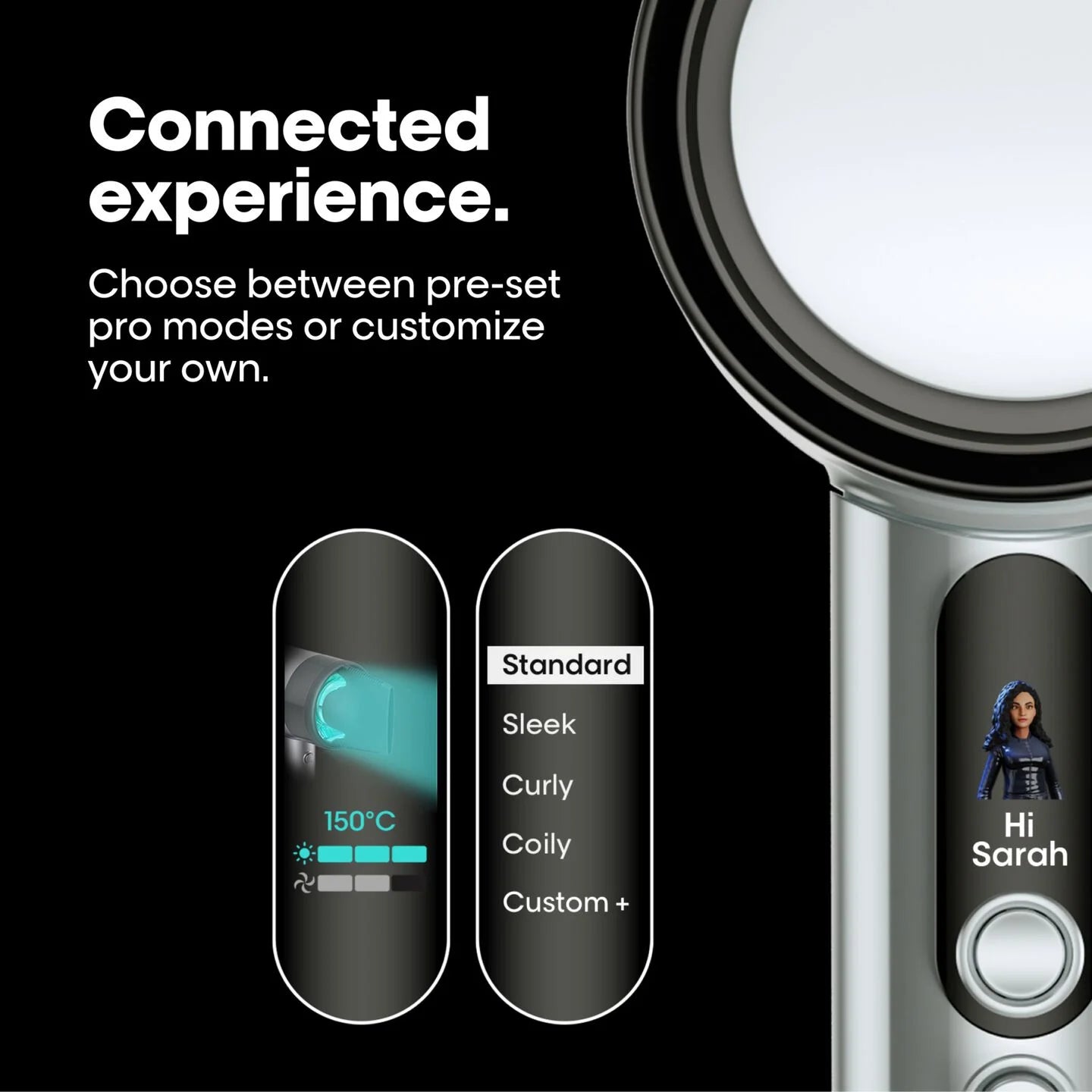 • Custom Mode: With the connected app, customize your own settings. Adjust in 5% increments for airflow and 15-20°F. Preset settings for straight, curly and coily hair.