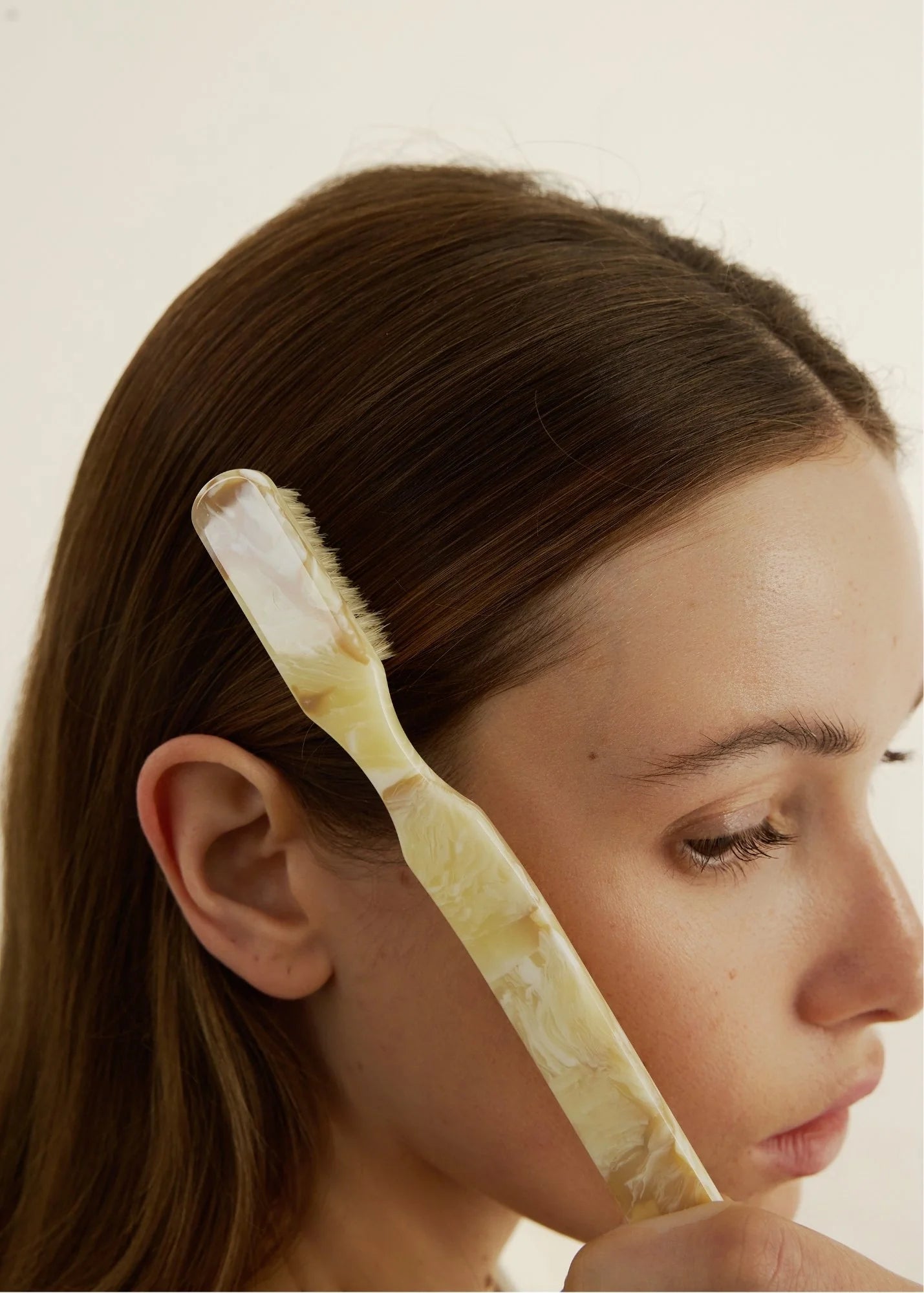 Smooth, tame, perfect. Our Detail Brush with pure boar bristles smooths flyaways in seconds. Compact enough for your vanity or on-the-go touch-ups.