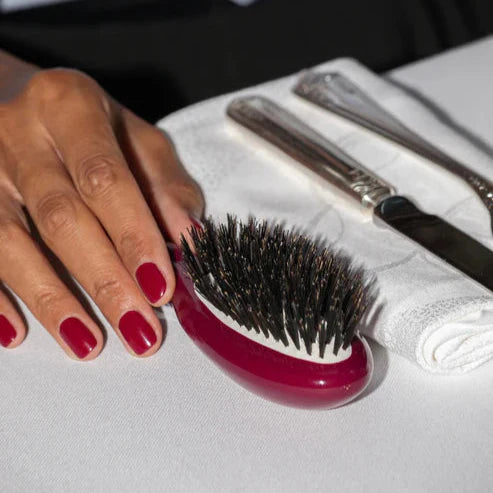 A compact boar bristle hairbrush designed to nourish, smooth, and enhance shine while promoting a healthy scalp.
