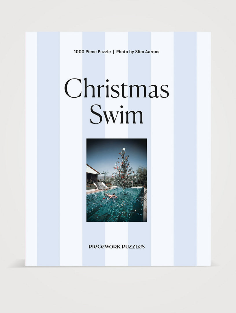 Christmas Swim is a 1000-piece Slim Aarons puzzle featuring his wife Lorita floating above Los Angeles in the 1950s—a timeless image of mid-century beauty and leisure.