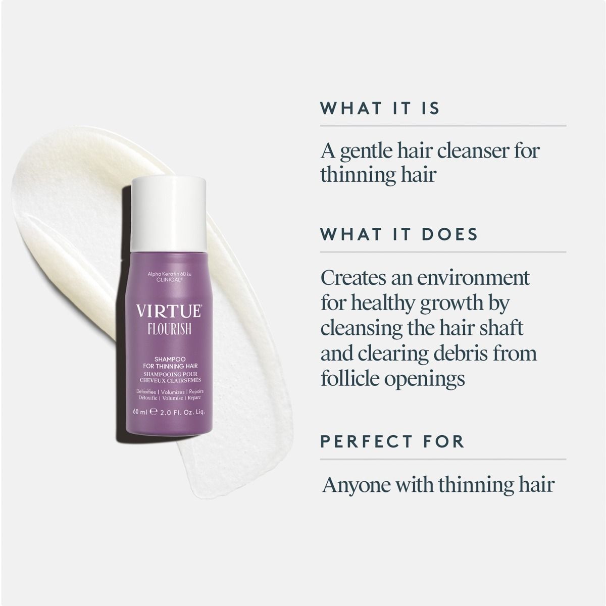 This gentle shampoo supports healthy growth and thickness by clearing debris from the follicle, balancing the microbiome, and nourishing hair and scalp with Alpha Keratin 60ku CLINICAL® protein and other fast-acting ingredients. Perfect for anyone with thinning hair.
