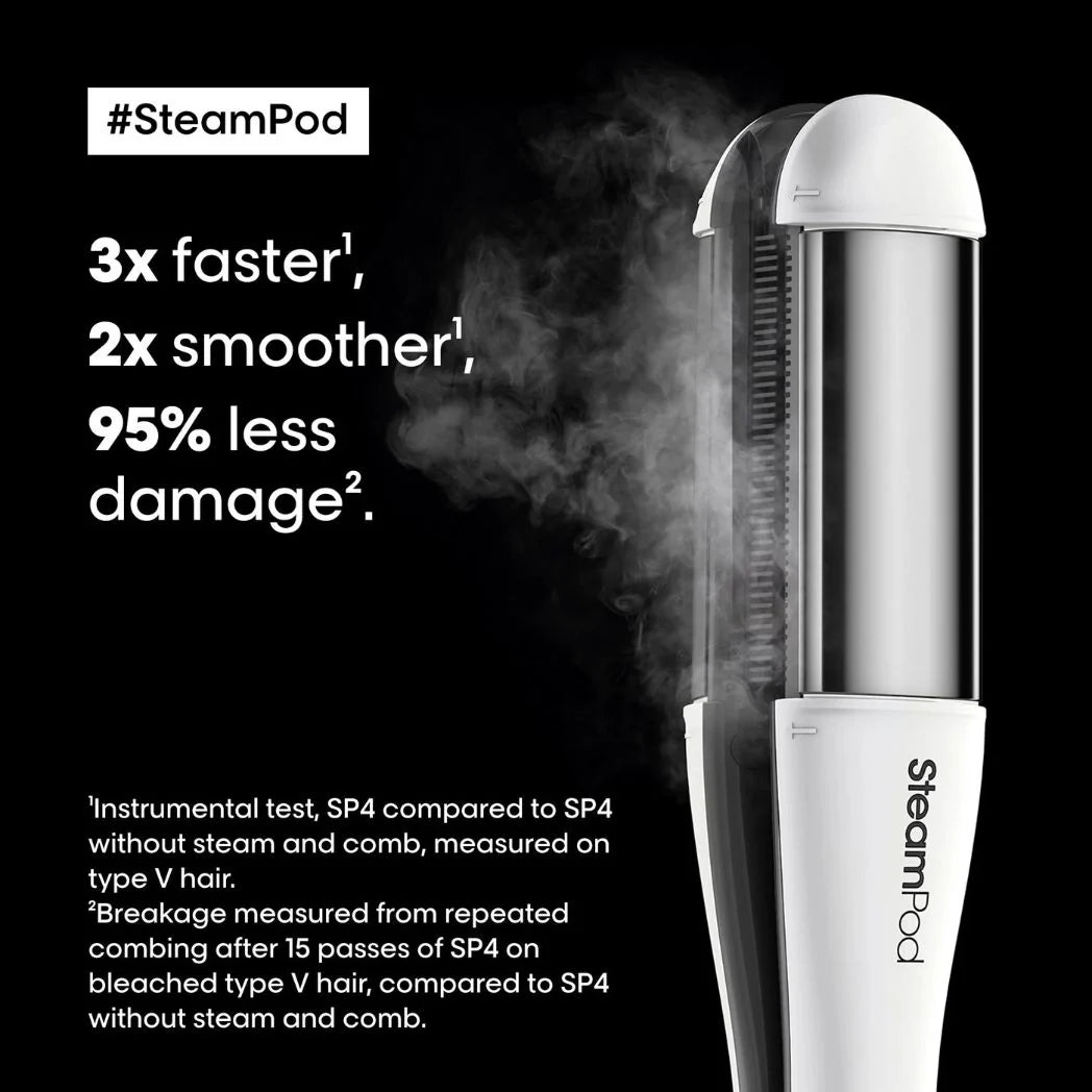 Experience the L'Oréal Steampod 4, the ultimate professional steam styler that makes achieving salon-quality results effortless. Whether you're looking for sleek, straight hair, soft waves, or defined curls, the Steampod 4’s patented steam technology delivers consistent heat for smooth, frizz-free styling with up to 95% less damage*. The floating ceramic plates and integrated comb glide effortlessly, leaving your hair shiny, soft, and beautifully healthy-looking.