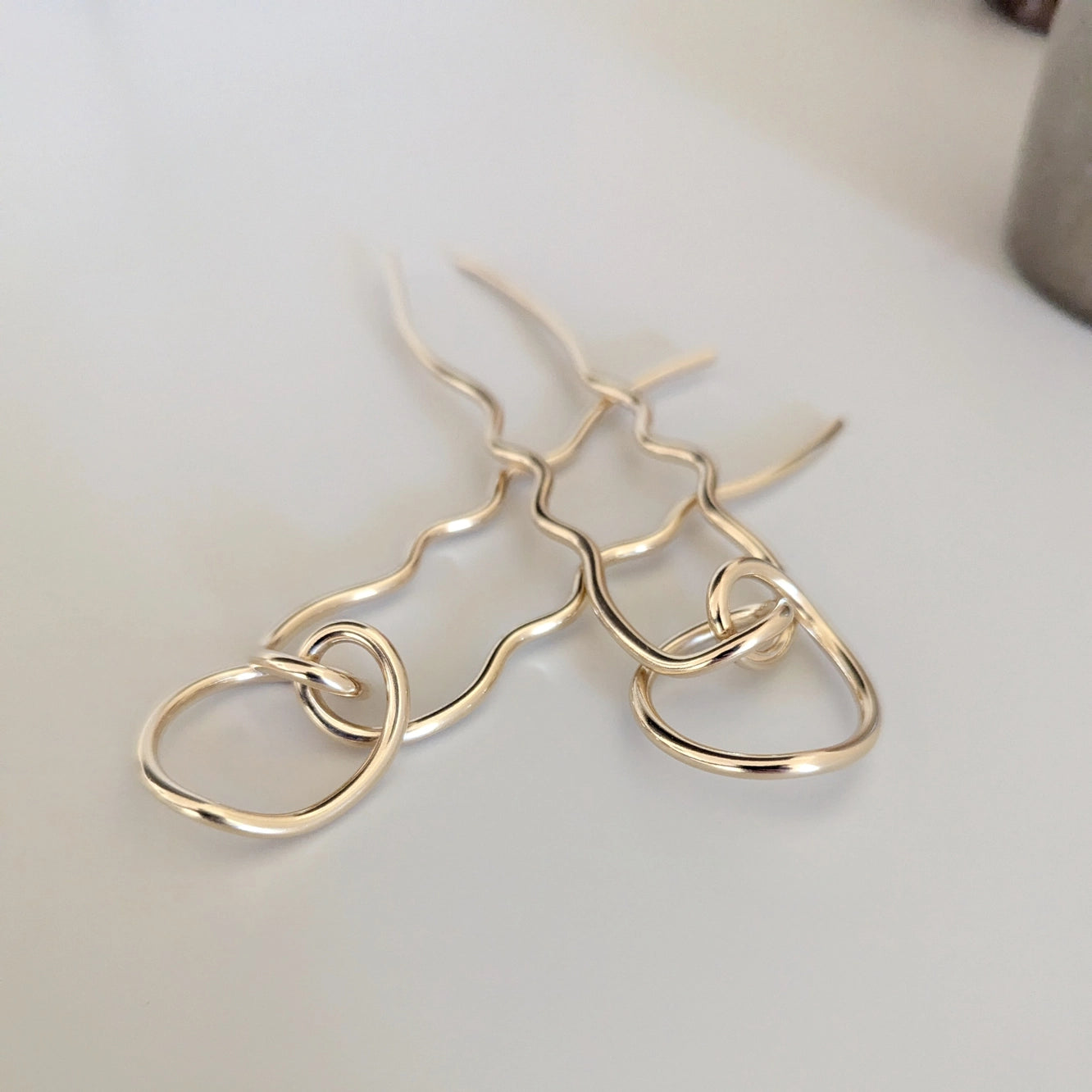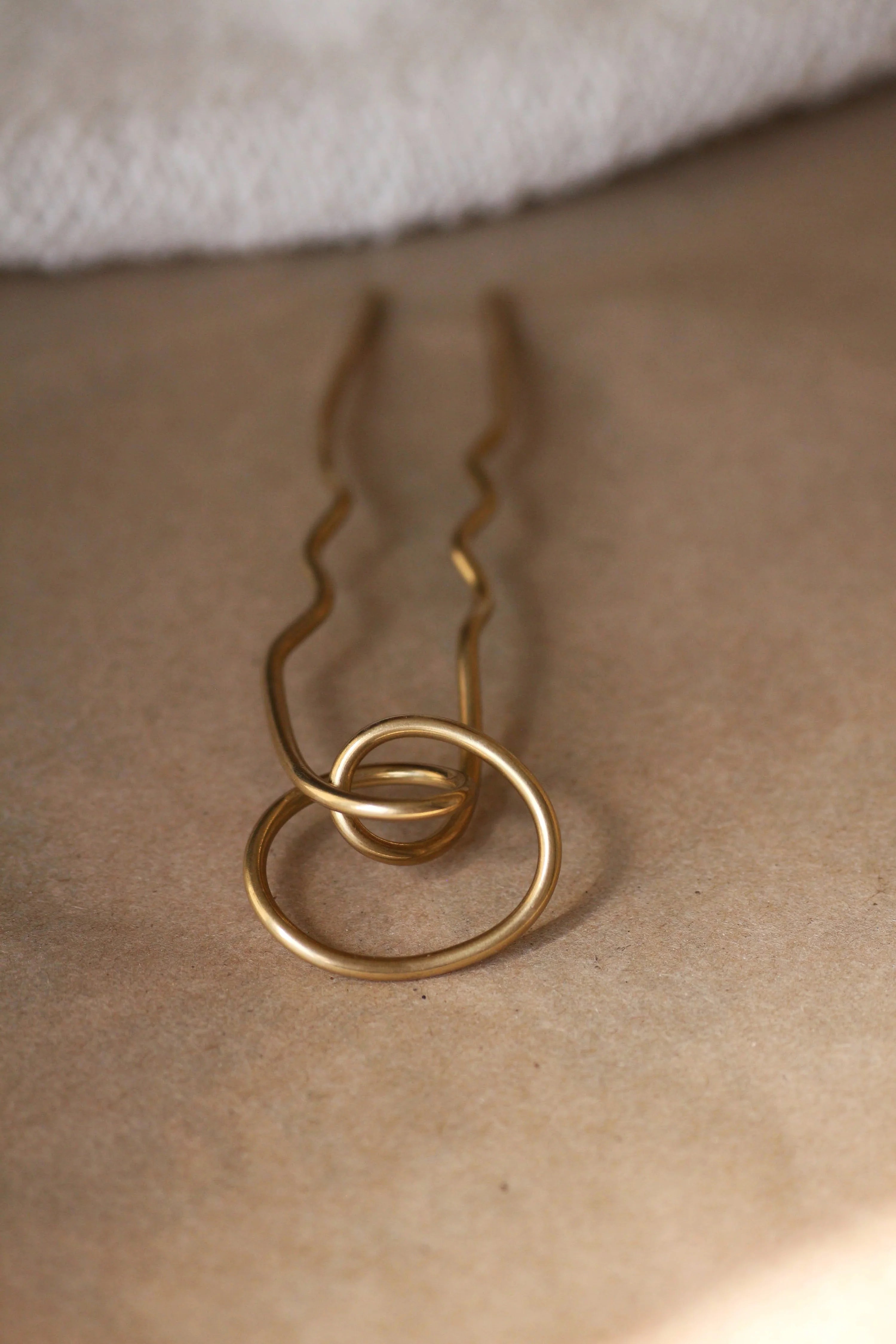 A sculptural solid brass hair fork, individually hand-formed so no two are exactly alike. Designed to weave through a bun or twist, it creates natural tension for a secure, all-day hold while adding an artful finishing touch.